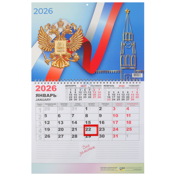 Календарь кварт настен 2026г 30*46 1греб с бегун Моно Госсимволика Квадра 9474